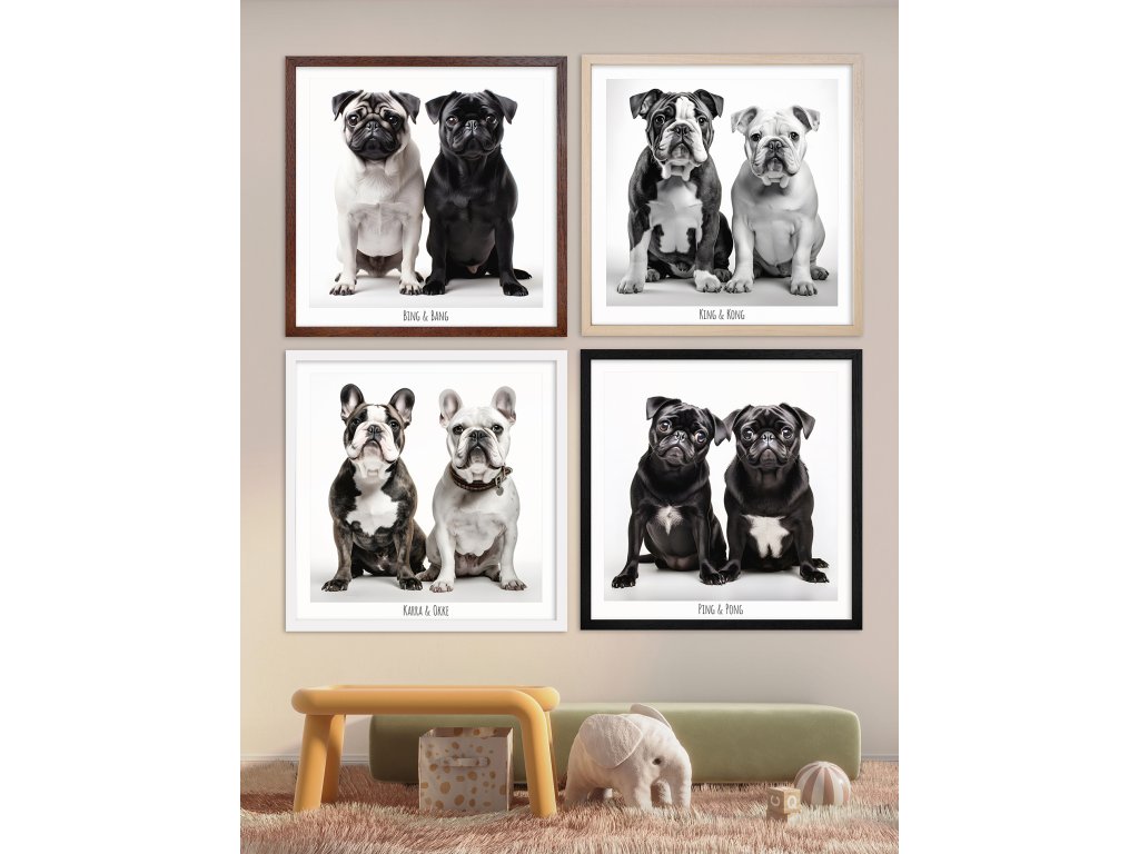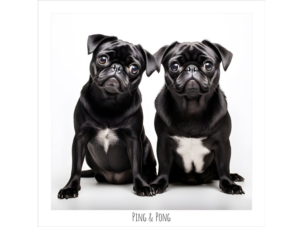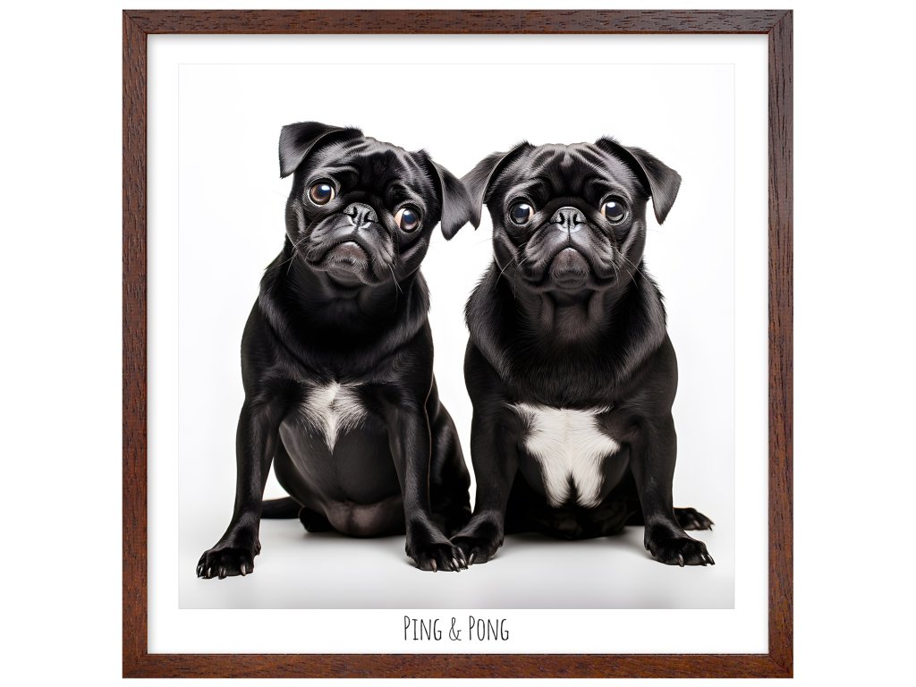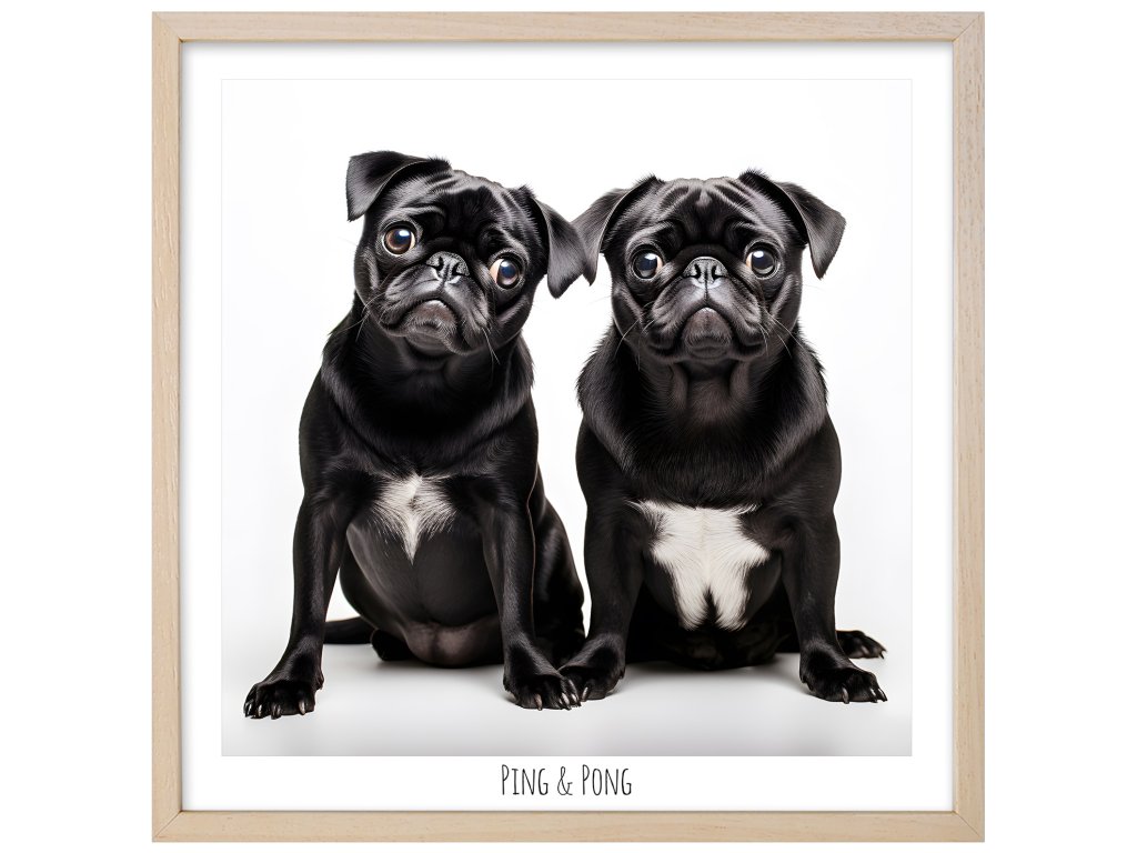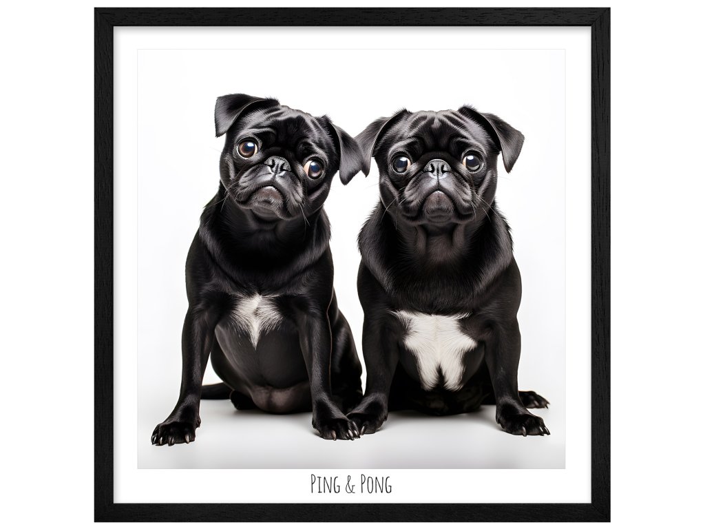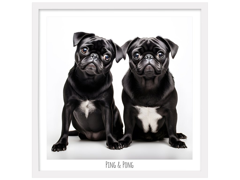 Ne náhodou vypadají jako sourozenci filmového Franka, psího agenta z blockbusteru Men in Black. Jsou opravdu z jednoho vrhu. Né, nejsou... i když, who knows. Dva v jednom, je tento plakát ze série domácích mazlíčků v kategorii Plakáty roztomilá zvířata. Nebojte se udělat si s ním radost. Ani Ping ani Pong neštěkají, netrhají sedačky, neunášejí ponožky, ani nečůrají tam vzadu za skříň, tam co se prostě nedá s tím hadrem pořádně dostat. Jsou milí, hodní, tiší a roztomilí. Co vy na to?