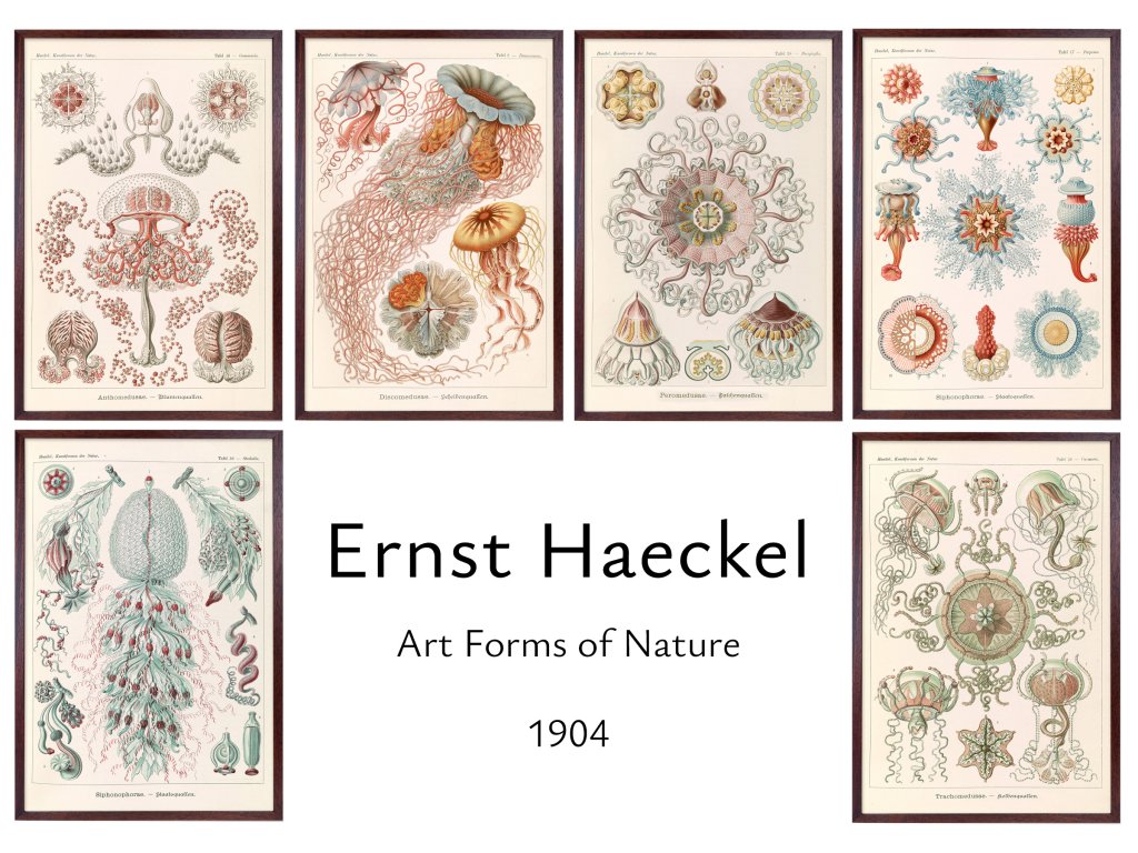 Ernsta Haeckel byl německý filozof, lékař, umělec, mořský biolog, profesor, 19. století, který našel krásu i v těch nejmenších tvorech a ukázal ji celému světu. Vyobrazení, která vidíte pocházejí z jeho knihy „Art Forms of Nature“ / Kunstformen der Natur. Toto Haeckelovo dílo "Umělecké formy přírody" obsahuje více než 100 detailních, mono i vícebarevných ilustrací zvířat a mořských tvorů. Díky své originalitě a geniálnímu podání bude svou estetikou dále ovlivňovat celé umělecké hnutí Art Nouveau.