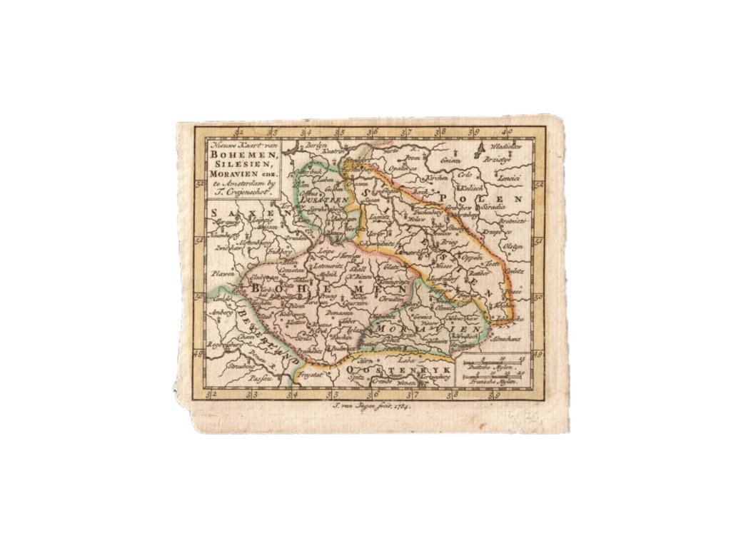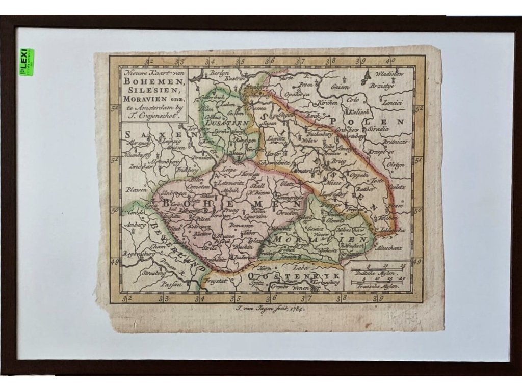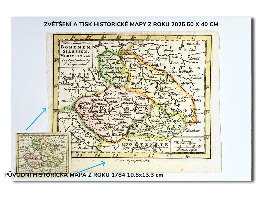 A také je to mapa Slezska, Lužicka a Moravy, bývalé německé federace Čech, Moravy a Slezska, nyní částečně Německo, Polsko a Česká republika. Tak jak uvádí tiráž v rámečku vlevo nahoře je vydána „v Amsterdamu J. Crajenschotem“ po roce 1784. Rytcem této mapy byl J. van Jagen, který jí vyryl právě v roce 1784, tak jak je uvedeno dole pod mapkou. Mapa pravděpodobně vychází z I. Tirionovy publikace „Nový a stručný ruční atlas, sestávající ze sbírky některých nejběžnějších a nejpotřebnějších map zemí“, Amsterdam, rok 1753, J.A. Crajenschotem, nakladatelem v Amsterdamu, vydáno ve zmenšené verzi po roce 1784. No a my ji opět zvětšili na o něco větší, než Jagenem vyrobená předloha. Dnešní technologie a trochu toho umu .... je prostě boží. Víc umu :-)